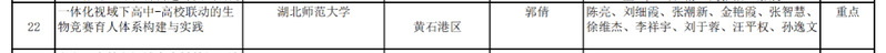 近日,黄石市教育局教育科学规划领导小组办公室公布了2025年度教育科学规划课题立项评审结果,实验教学示范中心郭倩老师主持的《一体化视域下高中-高校联动的生物竞赛育人体系构建与实践》课题成功获批高校组重点项目资助。24级研究生尹想主持的《从“看不见的生命”到“生物技术”:微生物学主题的大中小学学科教育一体化路径探索与实践》课题,成功获批(研究生专项)重点项目资助。