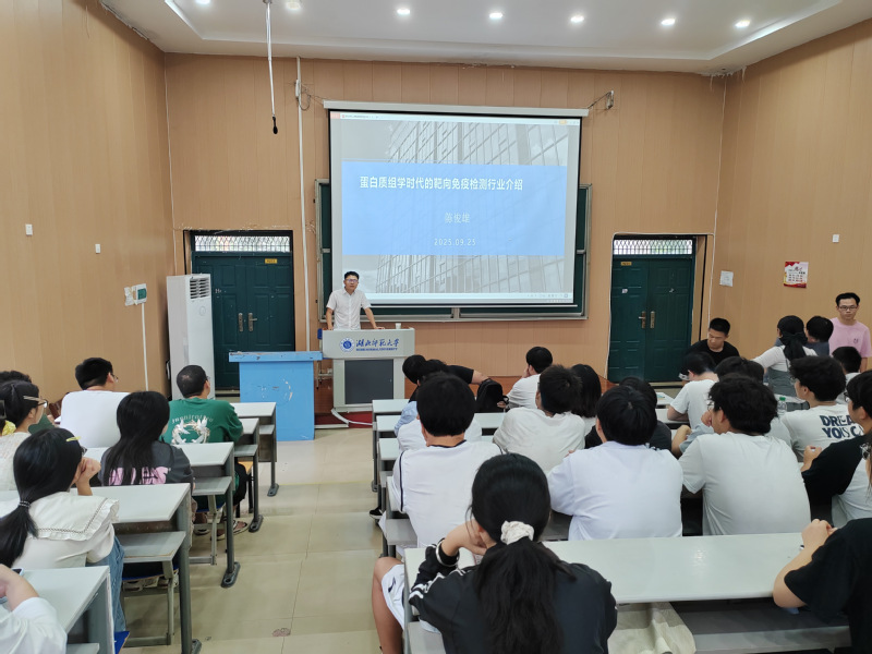 (通讯员 冯艳丽)2025年9月25日,黄石市蓝图生物科技有限公司董事长陈俊雄应邀为生物医药与大健康现代产业学院师生带来题为“蛋白质组学时代的靶向免疫检测行业介绍”的专题讲座。生命科学学院副院长李刚华、产业学院执行院长冯艳丽、产业学院副院长吴琴及相关课程负责人参与了本次活动。