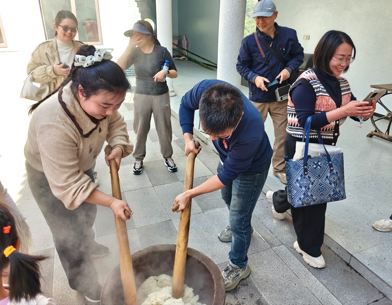 时至中午,大家抵达东方山脚下的就餐地点,分工会精心安排了打糍粑活动,并提供棋牌和卡拉OK娱乐。老师们纷纷拿起麦克风,一展歌喉。午后,经过短暂休整,大家再次启程,或攀登山顶,或在白马塔下远眺,欣赏层林尽染的秋景;或踏过520级台阶,登上鹊桥,远望东昌阁。
