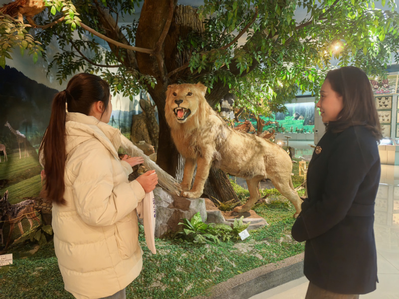 陆咏梅一行首先参观了学生社区的文化宣传栏,详细了解了社区工作举措与成果展示的相关情况。随后来到社区内的特色空间——动物标本室。在此,对接联系的学生、生命科学学院2301班张扬东作为讲解员,引导校领导参观并作了专业讲解。张扬东用扎实的专业知识讲述了标本背后的物种故事与生态知识,让静态的收藏展现出鲜活的科学魅力。陆咏梅对学生依托专业所长,主动参与社区管理与服务实践的做法表示赞许。