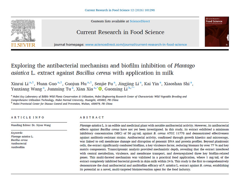 (通讯员 夏险)近日,我院天然产物发掘与综合利用团队在期刊《Current Research in Food Science》上发表论文“Exploring the antibacterial mechanism and biofilm inhibition of Plantago asiatica L. extract against Bacillus cereus with application in milk”。研究生李昕锐、本科生郭欢和研究生胡国俊为共同一作,本科生傅森洁为参与作者,夏险副教授为共同通讯作者。这是2025年度团队研究生和本科生协同培养的第三篇SCI 论文。Current Research in Food Science是Elsevier旗下农业与生物科学领域,SCI中科院大类一区Top期刊,2025年影响因子7.0。这也是本团队继(Ao et al., Frontiers in Microbiology, 2022)、(Ao et al., LWT, 2022)、(Ao et al., Microorganisms, 2024)、(Bao et al., Journal of Agricultural and Food Chemistry, 2024)、(Xia et al., Bioorganic chemistry, 2024)、(Liu et al., Plant Foods for Human Nutrition, 2025)、(He et al., LWT, 2025)、(Wei et al., Current Research in Food Science, 2025)后,聚焦抗食源性病原微生物的又一成果。