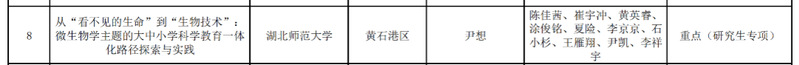 近日,黄石市教育局教育科学规划领导小组办公室公布了2025年度教育科学规划课题立项评审结果,我院郭倩老师主持的《一体化视域下高中-高校联动的生物竞赛育人体系构建与实践》课题成功获批高校组重点项目资助。我院24级研究生尹想主持的《从“看不见的生命”到“生物技术”:微生物学主题的大中小学学科教育一体化路径探索与实践》课题,成功获批(研究生专项)重点项目资助。