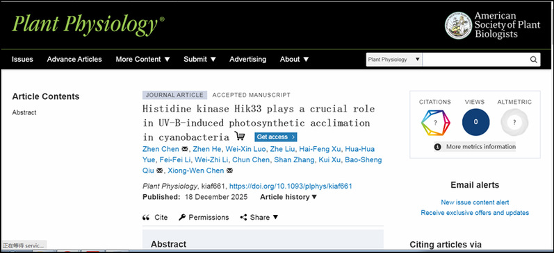 近日,我院食用野生植物保育与利用湖北省重点实验室陈珍博士团队在国际植物学领域经典期刊《Plant Physiology》(中科院一区TOP,IF(5Y):7.7)上发表研究性论文“Histidine kinase Hik33 plays a crucial role in UV-B-induced photosynthetic acclimation in cyanobacteria”。湖北师范大学生命科学学院为第一完成单位,陈珍博士为第一作者,陈珍博士、华中师范大学邱保胜教授和湖北师范大学陈雄文教授为共同通讯作者。